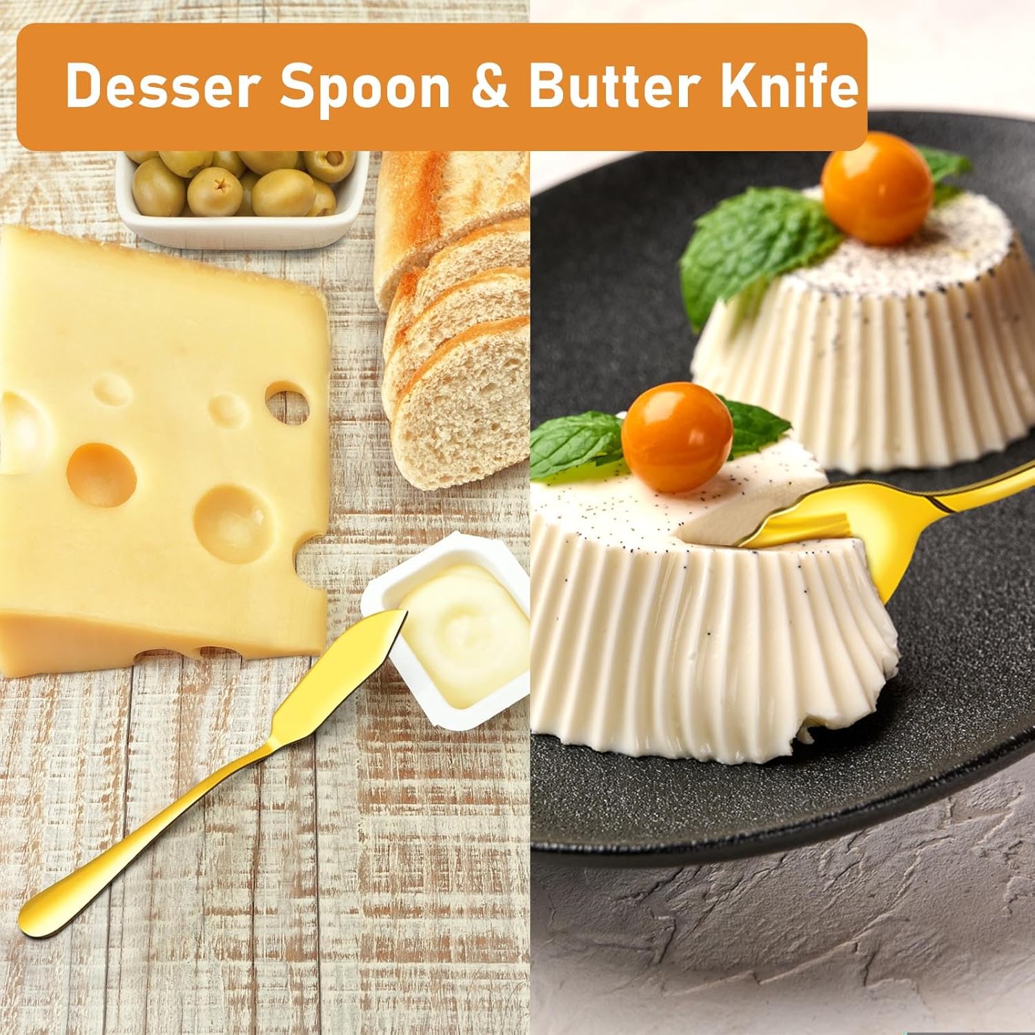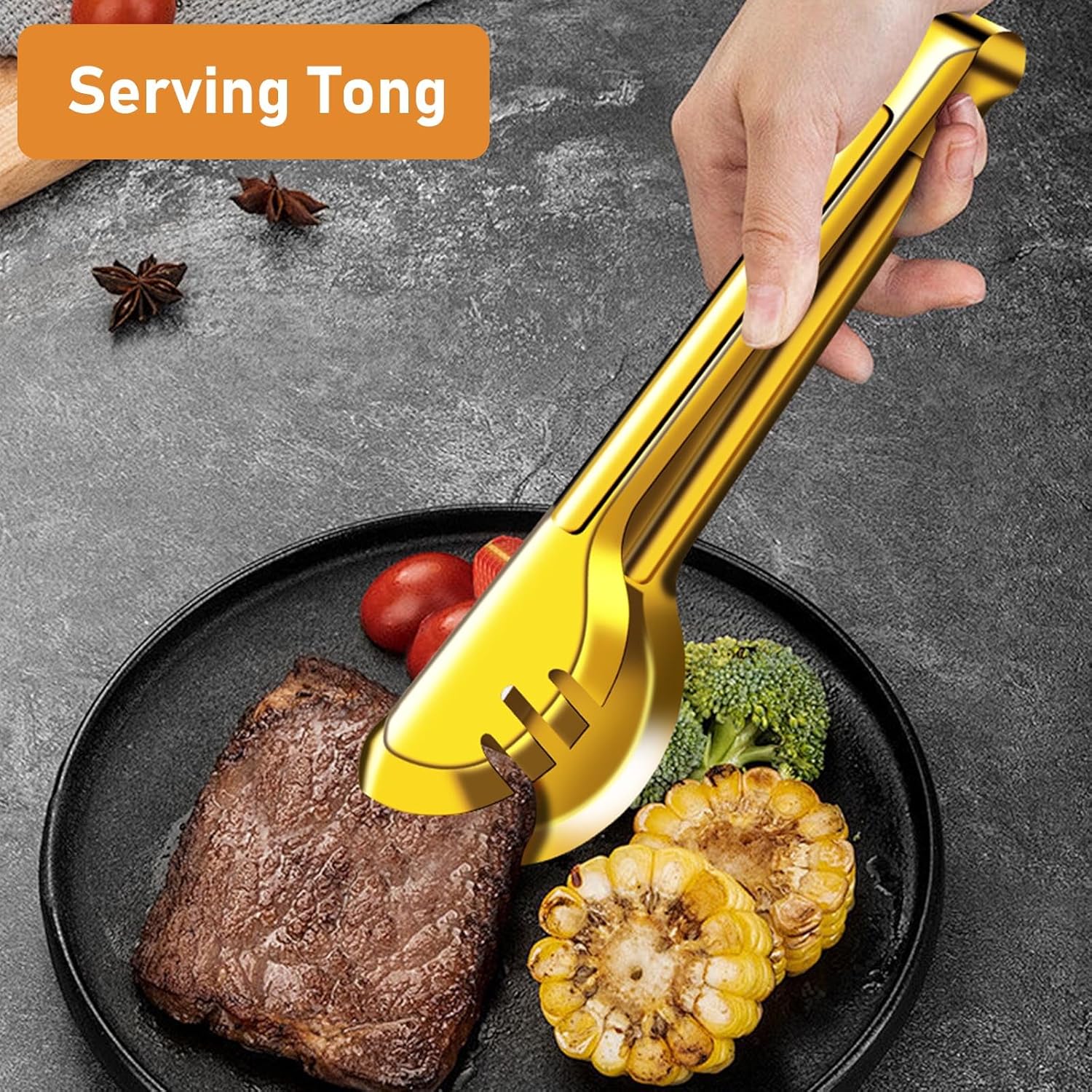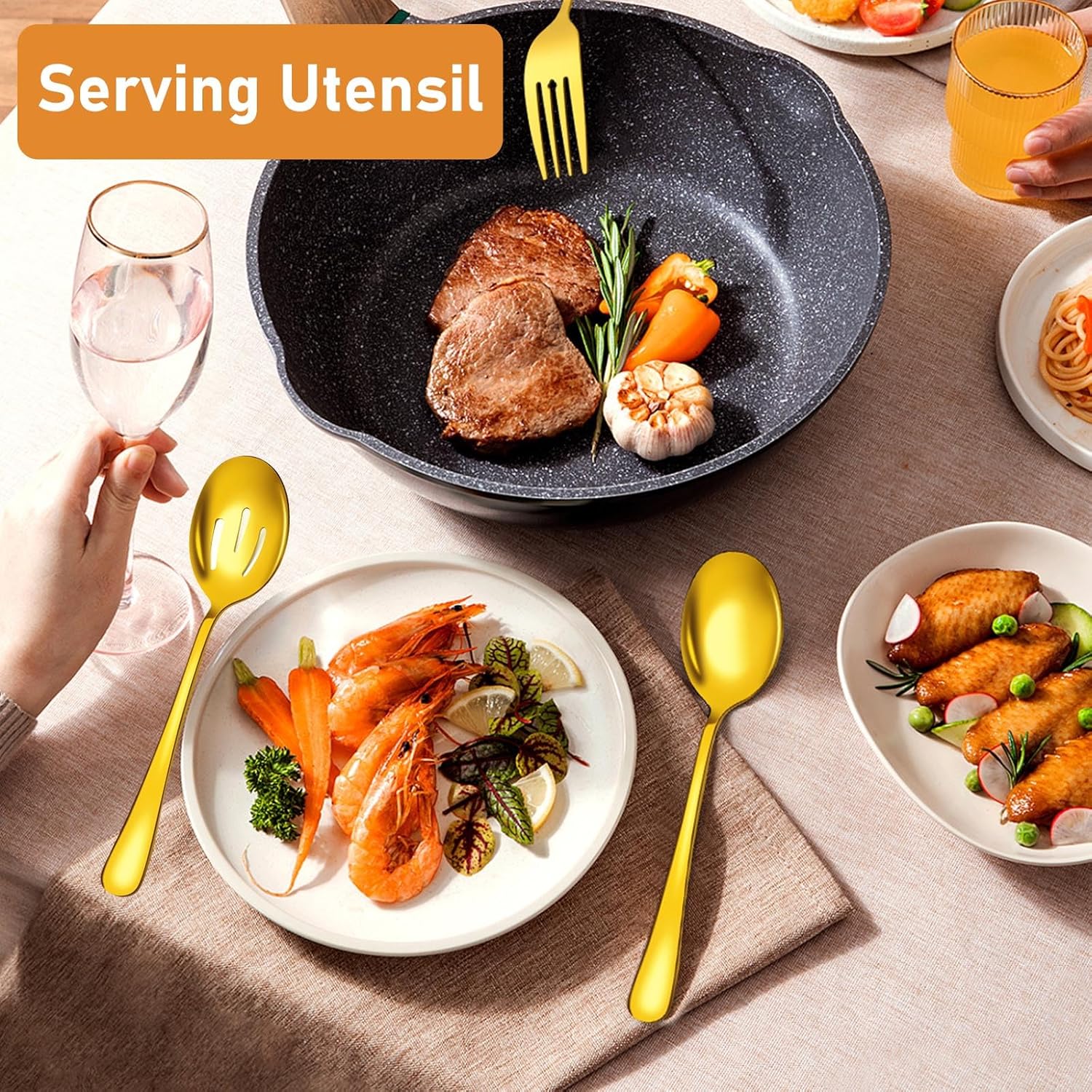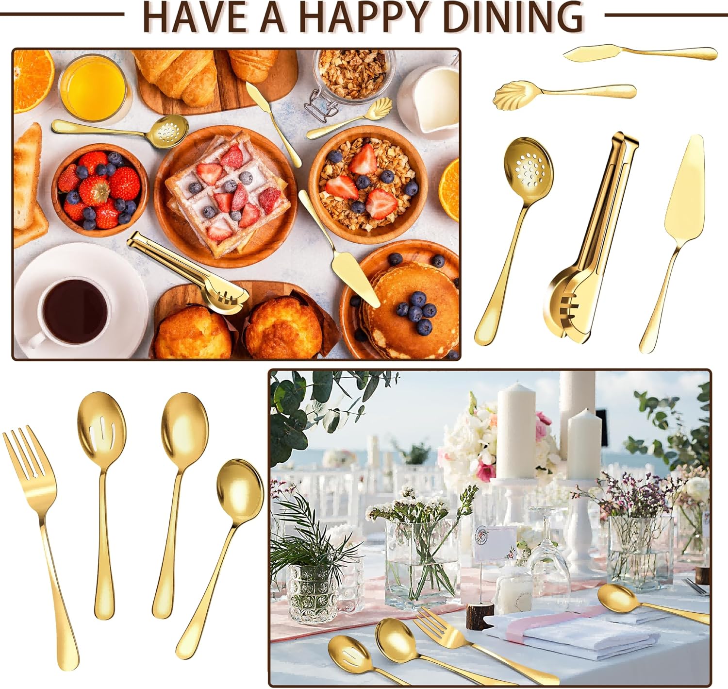 Serving Utensils Set for Buffet, 18 Pack Stainless Steel Serveware, Large Spoons, Slotted Spoon, Forks, Tongs, Butter Knife, Shell Spoons, Soup Ladle, Pie Server, for Party Festival Family, Gold quantity