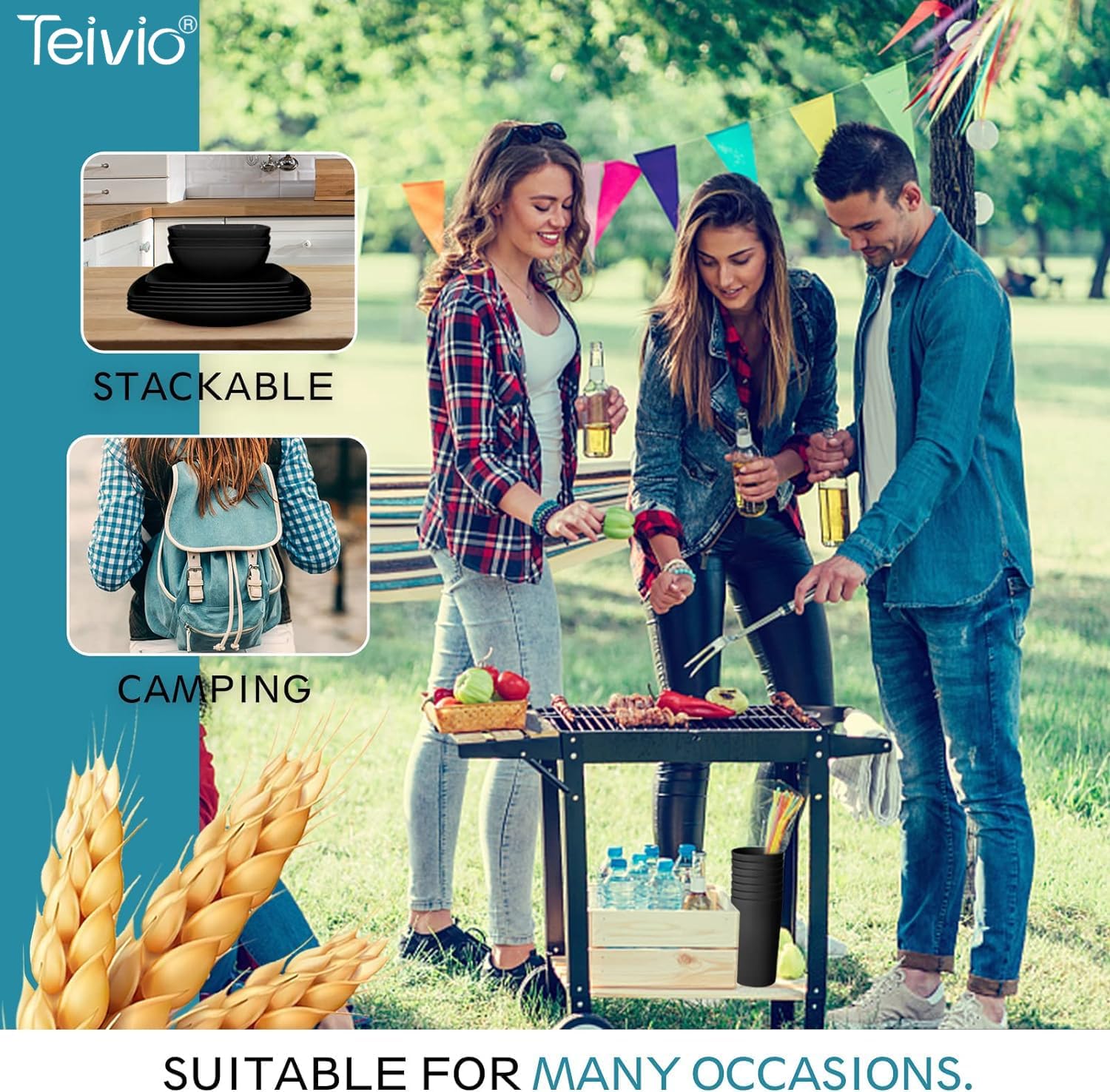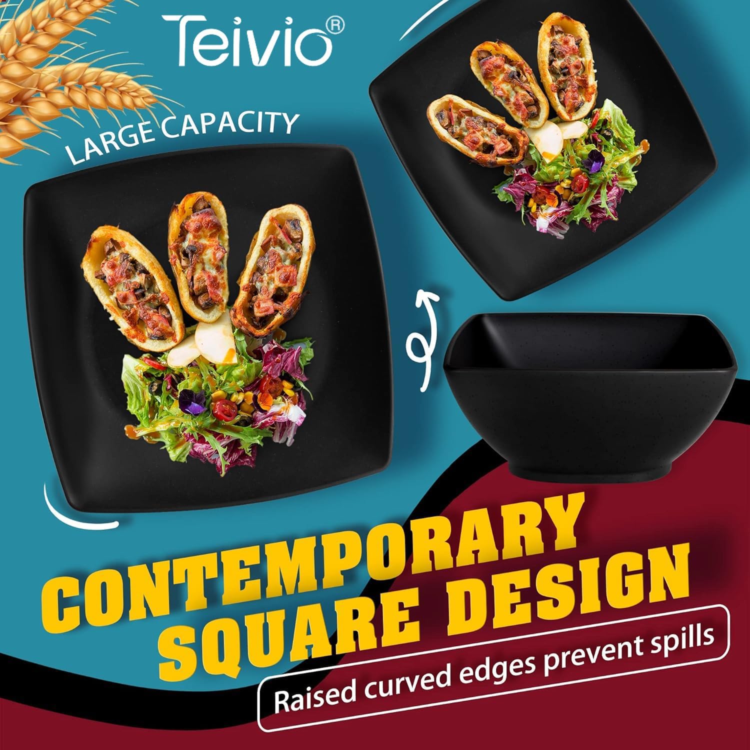 Teivio 32-piece Plastic Wheat Straw Square Dinnerware Set for 8, Unbreakable Dinner Plates, Salad Plates, Snack Bowls, Tumblers, Dishwasher Safe, Black