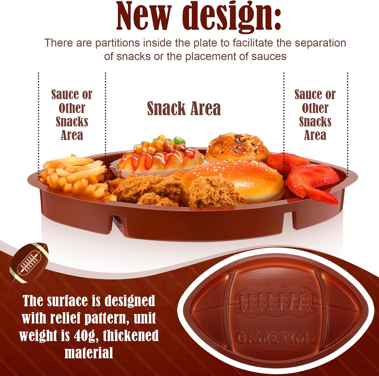 - New Style Design: the individual weight has reached nearly 40g, making it thicker and stronger; For the redesign, we chose a design that divides the whole into three parts; Two partitions divide it into three parts; We can put three different snacks on one plate without them touching each other, making our party richer; No football party is complete without chips and dip, and the way the chips in the middle, with different sauces on the sides, will have fans cheering